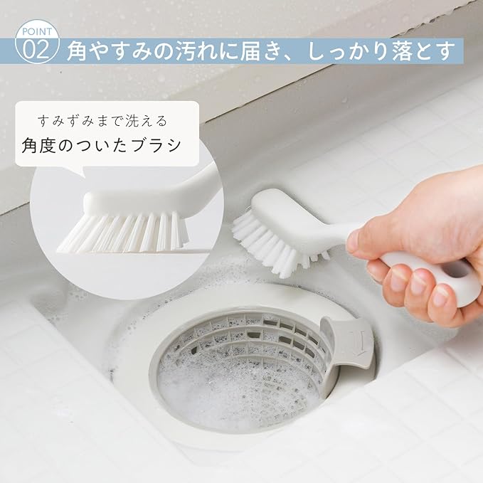 【すみずみまで洗いやすい】排水口や蛇口まわりなど細かい場所が洗いやすく、ブラシの先端が広がっているので、角やすみの汚れをしっかり落とします。