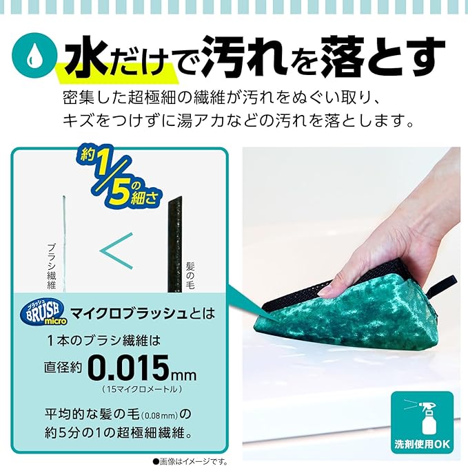直径約0.015mmの超極細ソフト繊維ブラシで、傷をつけずに湯垢などの汚れを落とします