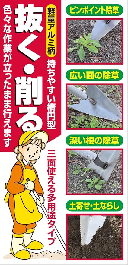 ・ピンポイント除草、広い面の除草、深い根の除草、土寄せ・土ならしなど多用途に使える
