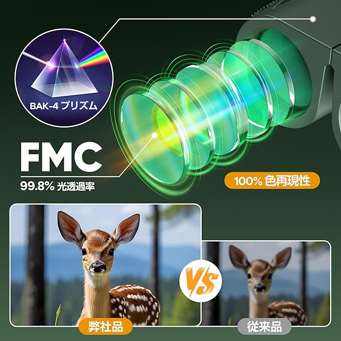 【業界先端光学性能】 BAK4プリズム&FMC多層コーティング採用の2025年最新モデルは、驚異的な99.8%の光透過率を実現。従来のBK7プリズムと比較して反射・散乱光を大幅に抑制し、光損失を最小化。コントラスト比150%向上により、薄暗いライブ会場や夕暮れ時のバードウォッチングでも、自然で鮮明な色彩再現が可能です。プロ仕様の光学設計が高精細画質と優れた視認性を両立し、長時間ご使用でも目に優しい設計となっています。