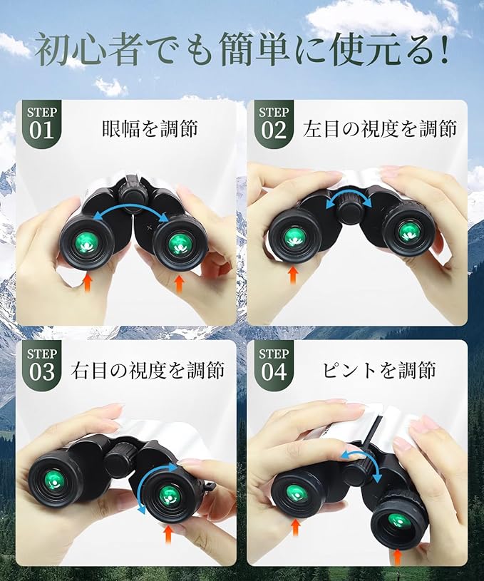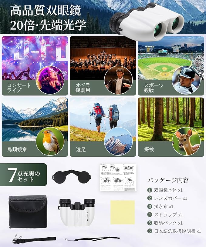 【充実の付属品&安心のアフターサービス】製品内容:双眼鏡*1、ネックストラップ*1、ハンドストラップ*1、レンズ拭きクロス*1、レンズカバ一*1、収納バッグ*1、日本語取扱説明書*1が付属しています。6ヶ月の品質保証付きで、安心してお使いいただけます。製品について、何がご質問があれ、または製品が不具合が発生する場合、お気軽にご連絡しでください、必ず丁寧に対応します。