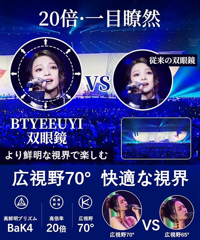 【防水機能&手振れ補正機能】小雨や霧などの悪天候の条件下でも、メガネクロスで簡単に拭いた後でも安心して使用することができます。防振、手振れ補正機能搭載します。BTYEEUYI防振双眼鏡には手ブレ補正機能が搭載されており、手の震えによる画像の揺れを効果的に軽減し、めまいや気持ち悪さを軽減することができます。