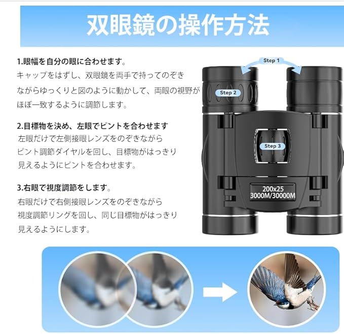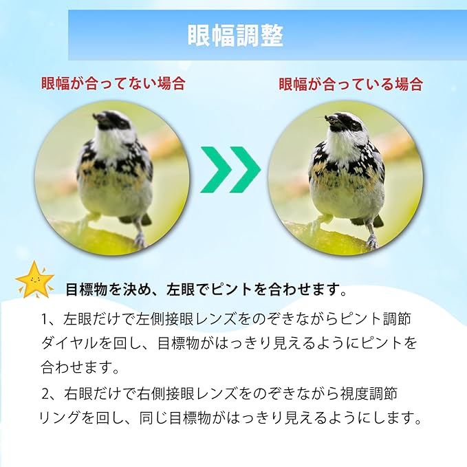 【扱いやすい】眼幅合わせ、ピント合わせ、双眼鏡の視度調整も簡単。双眼鏡の視度調整リングを調整すれば、左右の視力が異なる方でも快適にご覧になれます。初心者でも、簡単にバードウォッチングやスポーツ観戦などが楽しめます。オペラグラスとしても大活躍し、推し活にもぴったりです!