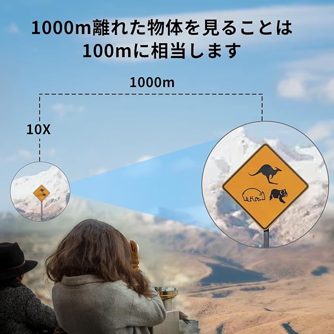 【手ぶれ防止】10倍調整・視角移動時の振動を防ぐ 、超高性能ハードウェア構成。倍率:10倍(倍率はズーム距離の10倍です。10倍の望遠鏡を使用して1000m先の物体を見ると100mに相当します。)高性能プリズム、6.5 の超広視野、ターゲットを簡単に見つけて捕捉でき、バードウォッチング、競馬、その他のレース活動に便利です。
