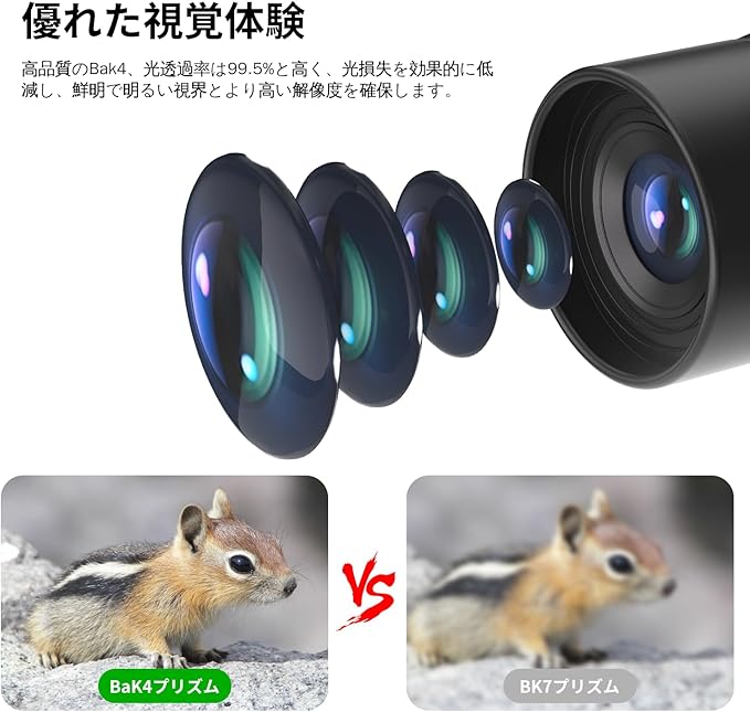 【高級BaK4プリズム】光学性能を飛躍的に高めるため、高級なBaKプリズムを採用しました。さらに、ポロプリズム方式により隅々まで明るくシャープな像を提供します。