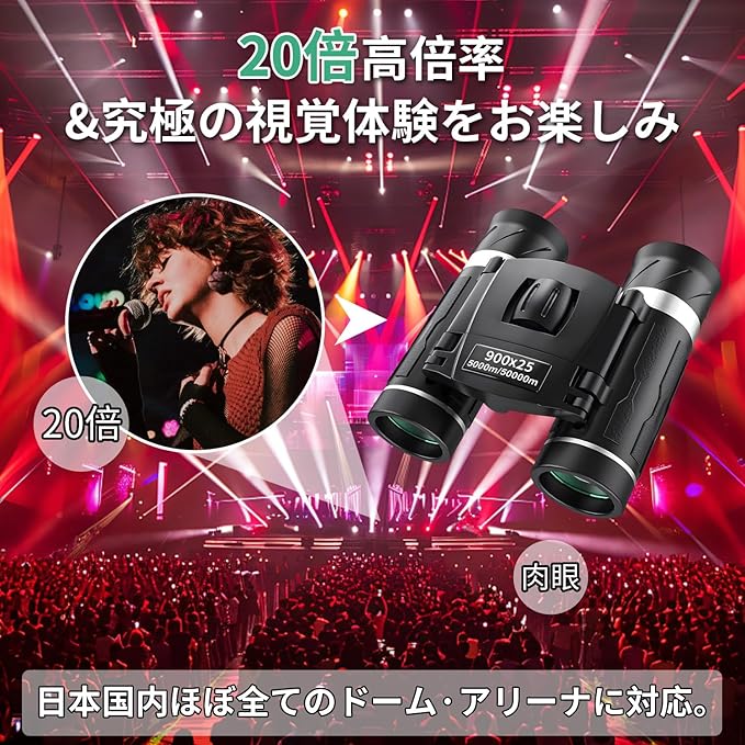 【2025業界トップ双眼鏡&20倍倍率】双眼鏡 ライブ用は20倍のズームを備えており、ドーム、アリーナ、スタジアムなどの大規模な会場での使用に最適です!双眼鏡の高倍率ズームと超広視野により、10メートル先の肉眼で見るのと同じ大きさで500メートル先の人まで見ることができます。これからは、臨場感や感動を逃すことはありません。