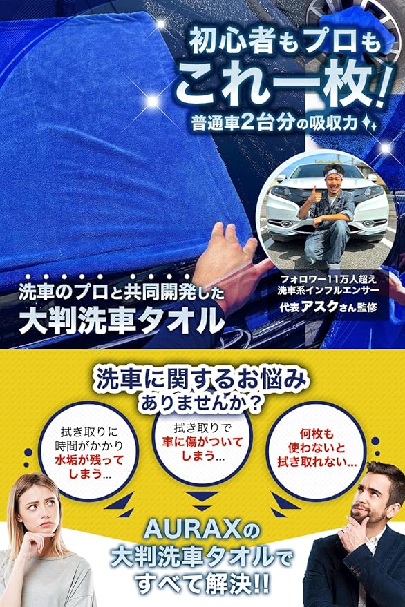 ✅【洗車インフルエンサーASK氏監修|初心者でもプロ級の仕上がり】TikTokフォロワー11万人超の洗車インフルエンサーASK氏が監修。素材選定・厚み・吸水性・扱いやすさを徹底的に追求し、初心者でもプロのような拭き上げが実現する大判洗車タオルです。