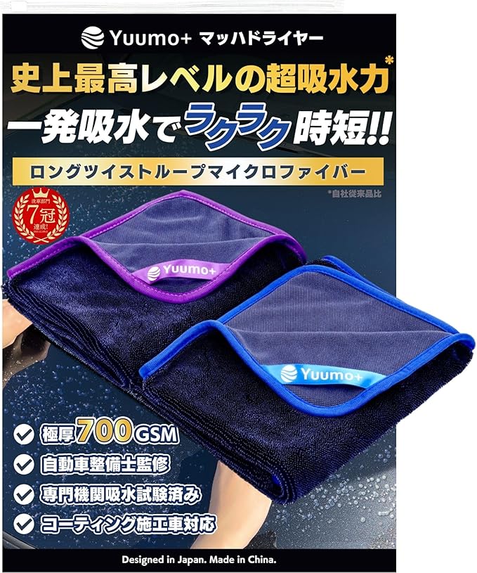 【整備士監修x極厚700GSM】 洗車 タオル 『"感動レベル"の一発吸水!!』 マイクロファイバークロス 車 大判 超吸水 プロ仕様 Yuumo+(ユーモプラス) マッハドライヤー M(60 50cm)2枚セット(青+紫)