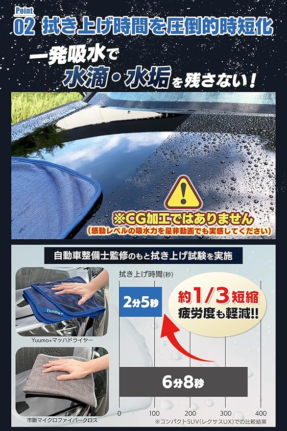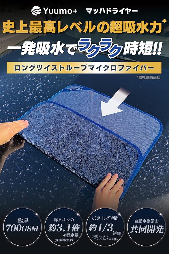 ✅【拭き上げ時間を約1/3にラクラク時短化】独自のロングツイストループ製法で、市販マイクロファイバークロスと比較し、優れた吸水力・耐久性を実現。拭き上げ時間は市販マイクロファイバークロスと比較し、約1/3に短縮。洗車時間短縮&疲労軽減でお手軽に洗車できるため、愛車をいつもピカピカな状態に保てます。いつものドライブがより楽しくなり、あなたのカーライフをさらに充実させること間違いなし。