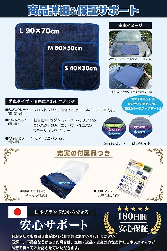 ✅【商品詳細】●セット内容:洗車タオル、厚手スライド式チャック収納袋 1、使用方法&お手入れガイド 1 ●Sサイズ:横40 縦30cm ●Mサイズ:横60 縦50cm ●Lサイズ:横90 縦70cm ●生地厚さ:700GSM ●カラー:タオル生地:ネイビー・縁:ブルー ●素材:ポリエステル80%・ナイロン20% ●お手入れ方法:洗濯機・手洗い〇、乾燥機 、中性洗剤〇、漂白剤・柔軟剤 、洗濯後は風通しの良い場所で陰干しで乾燥させてください(天日干しの場合はタオル地を内側にして乾燥させてください)。 ✅【安心の180日間品質保証】アフターサポート用の公式LINE窓口(日本人対応)を用意しており、サポート体制は万全です。万が一、商品に不具合がございましたら、直ぐにご連絡ください。最後まで誠心誠意対応させていただきます。