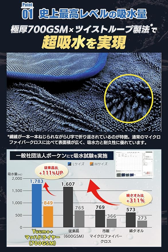 ✅【史上最高レベルの超吸水力*】極厚700GSM ツイストループ製法のマイクロファイバータオルが水滴を一瞬でキャッチし、水垢を残さず、愛車の表面を素早く拭き取ります。吸水量はMサイズ:849mL、Lサイズ:1,783mLと従来品(600GSM)比+111%アップ、市販マイクロファイバークロス比+232%、綿タオル比+311%(一般社団法人ボーケンにて吸水試験実施。*当社従来品比)。洗車タオルの縁部分は、柔らかくて車の表面を傷つけにくい弾力性の高いナイロン生地で縫製。塗装やコーティングなどの表面を傷つける心配もありません。