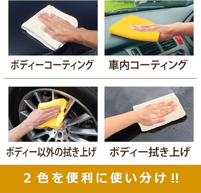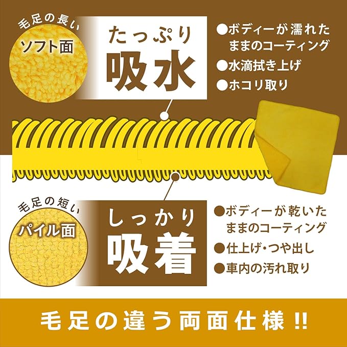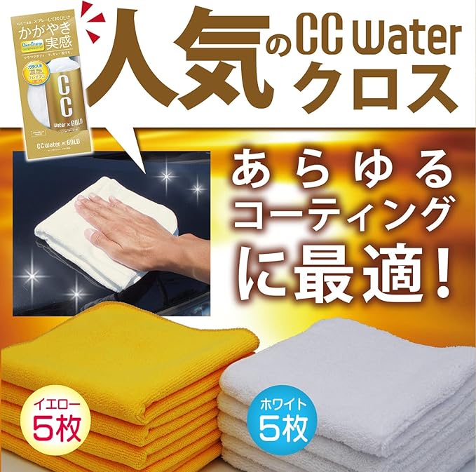 スプレーして拭くだけで簡単コーティングができる“CCウォーター"施工用のマイクロファイバークロスです。<br>両面の毛足の長さが異なり、濡れたままのコーティングには「毛足の長いソフト面」、乾いた状態からのコーティングには「毛足の短いパイル面」と、ボディーの状態によって両面の使い分けが可能。CCウォーターの効果を最大限に引き出します。<br>2色入で、ボディー・ガラス・ホイール・車内など、使用箇所に合わせて使い分けができ、コーティング作業はもちろん車の様々なお手入れにもお使いいただけます。