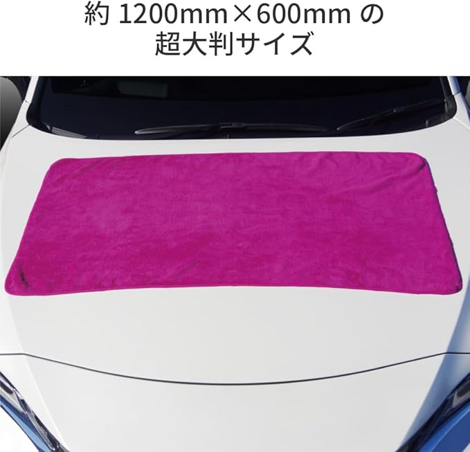 洗車後の水滴の拭き取り作業効率が大幅UP。フェイスタオルのようなふわふわ素材でボディに優しく、傷になりにくい高品質マイクロファイバークロスです。約1200x600mmのバスタオルサイズでボンネットやルーフ等、一気に拭き上げできます。