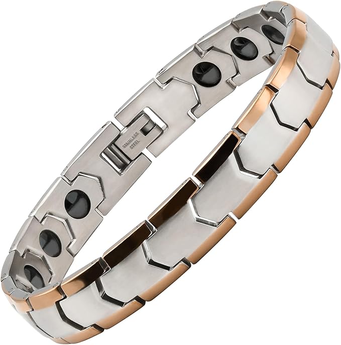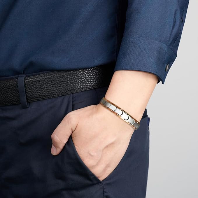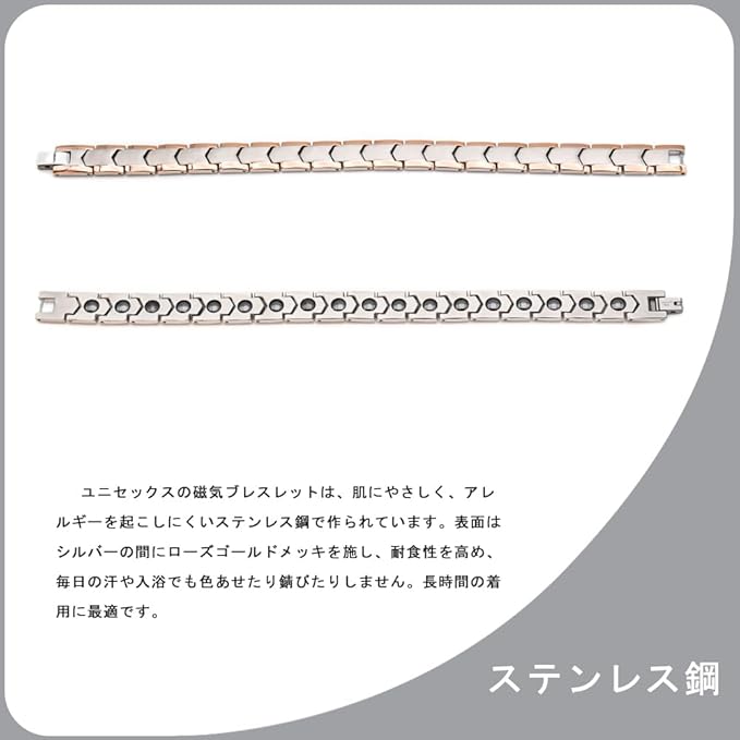 【肌にやさしい】:ユニセックスの磁気ブレスレットは、肌にやさしく、アレルギーを起こしにくいステンレス鋼で作られています。表面は、耐食性を高め、毎日の発汗や入浴中に色あせや錆びない黒い電気メッキプロセスを採用しています。長時間の着用に最適です。