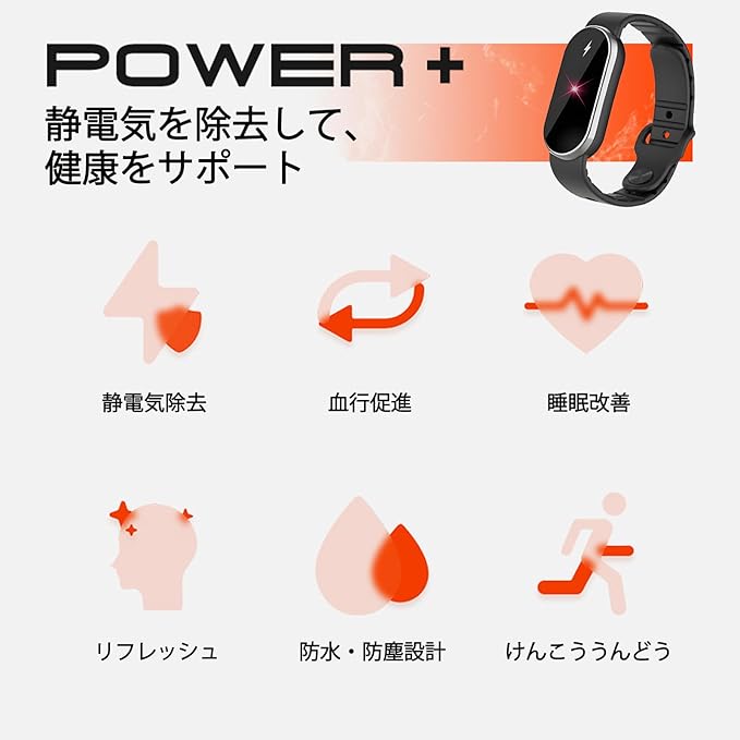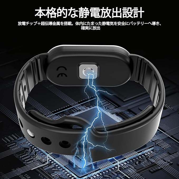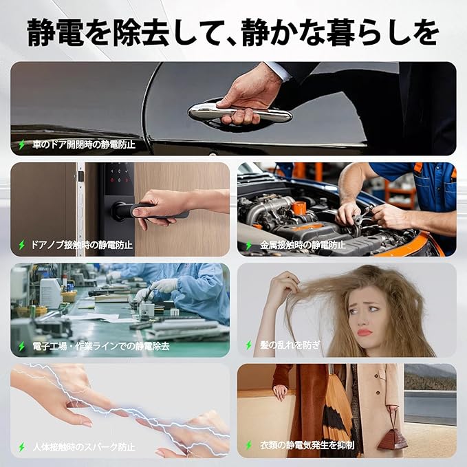 【接地放電技術で静電気を根本除去】金属導体を通じて人体の静電気を接地し、内蔵バッテリーに放電する独自構造を採用。衣類の摩擦や乾燥によって発生した静電気を瞬時に吸収・除去し、ドアノブや車に触れたときの「パチッ」とした痛みを軽減します。