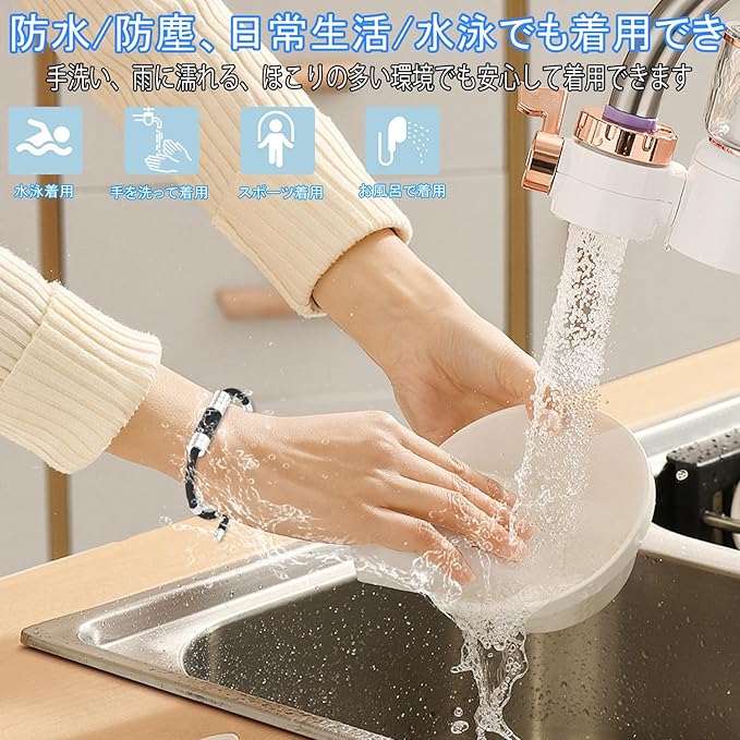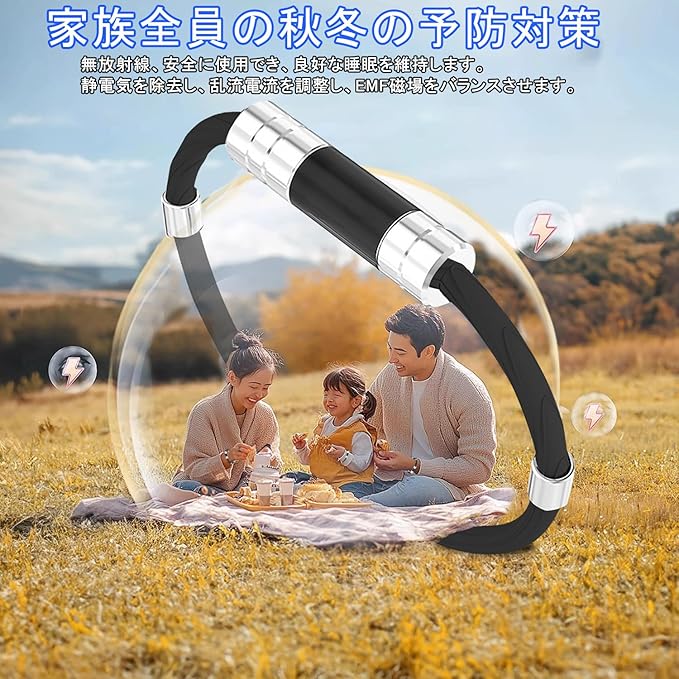 【静電気除去】ブレスレット中央には、太幅の黒色セグメントとシルバー金属部が組み合、ここが静電気除去の主要な機能部であることが、視覚的にもアクセントとなっている。磁気リングを形成することで人体の電流の正負比を調整し、静電気を除去する効果を実現します。効果は人によって異なります。通常2~3週間以内。着用時間の延長により、効果はますます良くなります。そのため、乾燥した冬や静電気が発生しやすい環境でも、このブレスレットを着用することで静電気の問題を防ぐことができます。