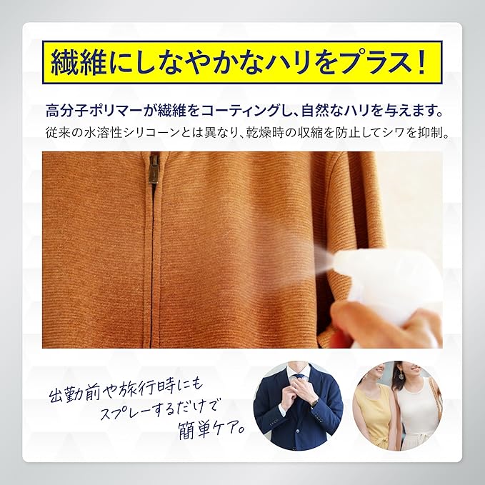 ✅シワ低減成分が繊維をコーティングして自然なハリを与えます。乾燥時の収縮を抑制するため、シャツやコートなどのシワを予防し、外出先でも服をきれいな状態に保ちます。ベッドやカーテン、ソファの布地にも使える万能スプレーです。