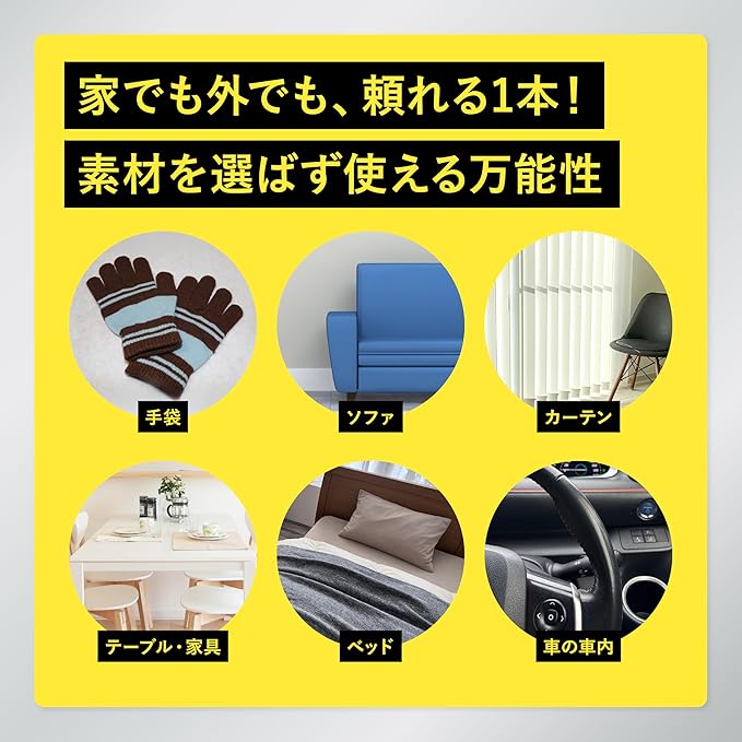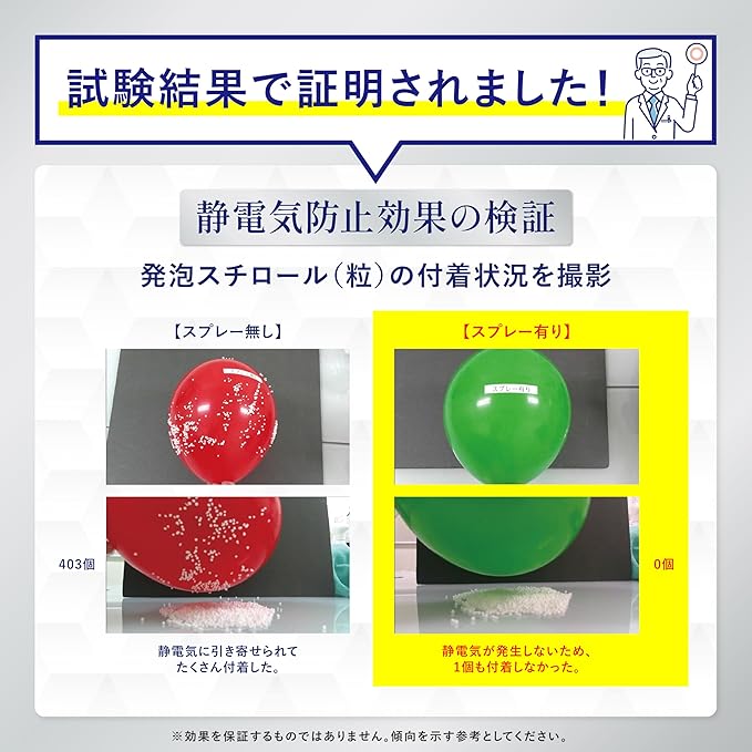 ✅帯電防止試験では静電気がほぼ発生しないという結果を確認。スプレーを吹き付けた素材に発泡スチロールの粒子が付着しにくくなるなど、高い防止効果が実証されています。出かける前や車の乗車前にサッとひと吹きするだけで、快適な生活をサポートします。
