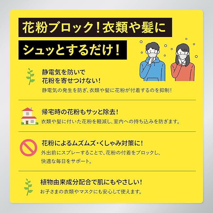 ✅花粉やホコリの付着も抑えるので、季節を問わず使いやすいのが特長。さらに除菌・ウイルス除去にも配慮した処方で、帰宅後の衣類についたウイルス等も素早くケアできます日々ストレスフリーに使用可能です。