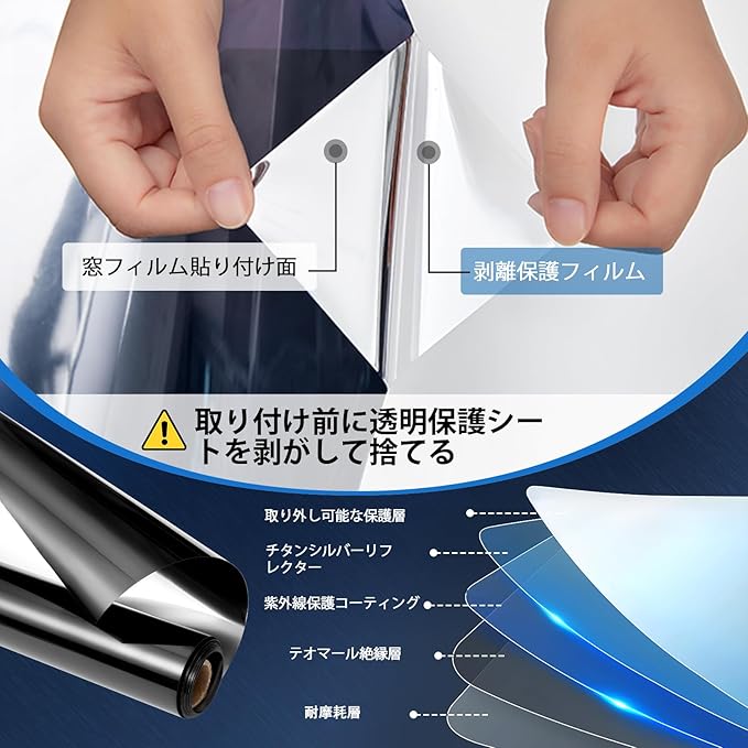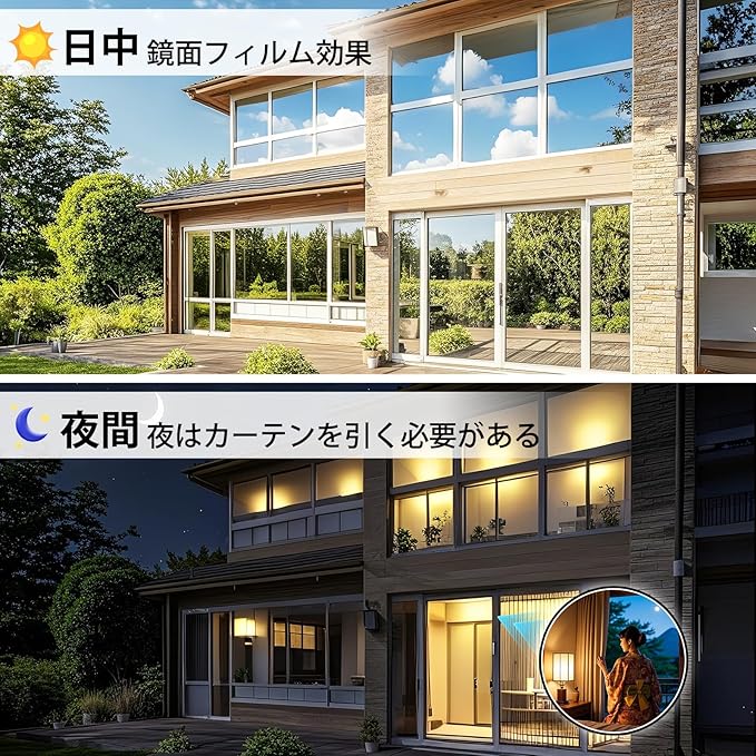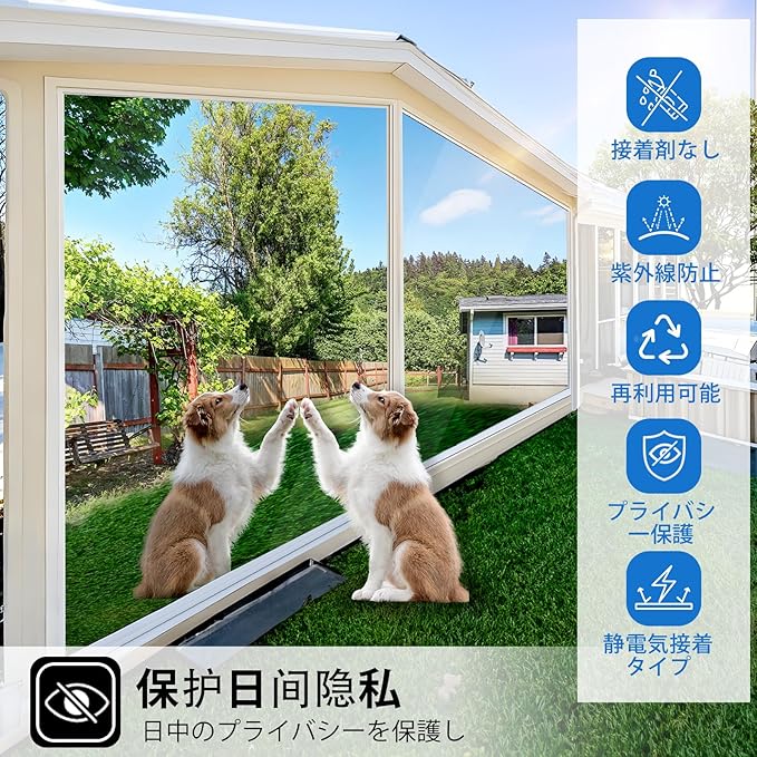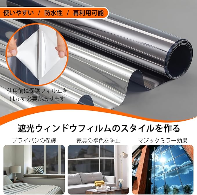 【マジックミラー・目隠し】充分な天然の日光を室内に取り込めて明るさを維持しながら、外からの視線を遮ります。大切なプライバシーをきちんと守ります。昼間は外から見ると鏡のように人影を映す同時に、高い目隠し効果を生かします。室内から見ると、紺色の透明シートに見え、視界を損なわず、気軽に外の風景を眺めます。一般家庭のガラス窓、オフィス、会議室、事務室などの目隠し装飾に非常に適用しています。室内が屋外より明るい場合(夜間、照明を使う場合など)には室内が見えますのでご注意下さい。