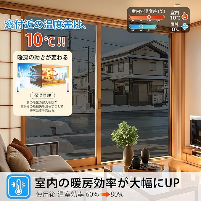 【防寒遮熱・コスト削減】チョッピリだけですが、冬は暖房で暖めた室内の熱を窓から外へ逃げるのを抑え、夏は暑い外気熱が室内へ流入するのを軽減でき、電気代節約に貢献します。冬の暖房ロスを30%軽減・遮熱率80%、四季に利用されるお買い得の一枚です