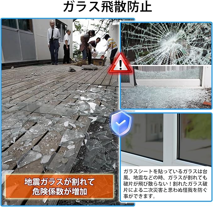【ガラス飛散防止・ガラスキズ防止】 貼り付け操作が終了後、静電気吸着タイプなので粘着力が戻り、台風、地震などの時、ガラスが割れても破片が飛び散らない! これにより、ガラスの破片による二次災害や不測の被害を防ぐことができます。また、不注意によるガラス表面の傷を防ぐこともできます