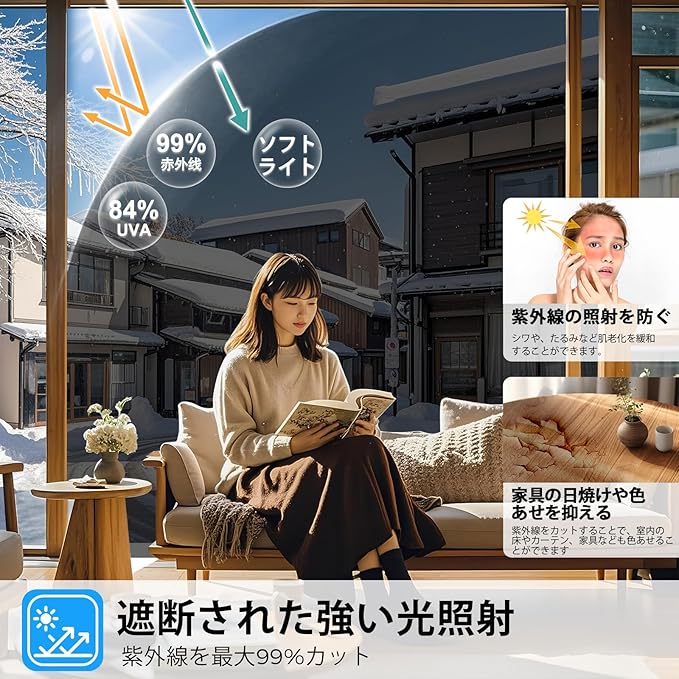 【uvカット・光線を調節する】遮光フィルムは眩しい直射日光を和らげて、肌を刺さるチクチク感などの不快を取り除き、快適な室内空間を演出します。ガラスを通して有害な紫外線が室内に入るのを多くブロックします。家具やフローリングを紫外線による色あせから守ります。フローリングや畳、カーペットなどの床材、室内の家具や調度品の紫外線による日焼けや劣化を防ぎます。