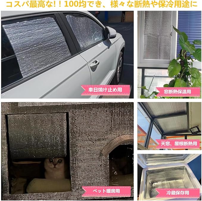 【様々な使い方】夏は外気温(熱線)を遮熱・反射して、屋根・外壁からの輻射熱を遮断し、室内温度を上げません。冷房の冷気を室内に反射させ、外に出さず冷房効率を高めます。冬は冷たい外気温と地面からの冷気を反射し遮断して室内温度を下げません。車や窓の断熱用、各種家庭用電気製品、厨房機器、冷暖房機器等保冷用に最も適した。