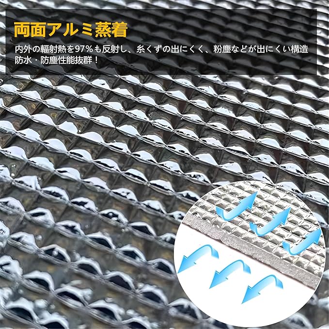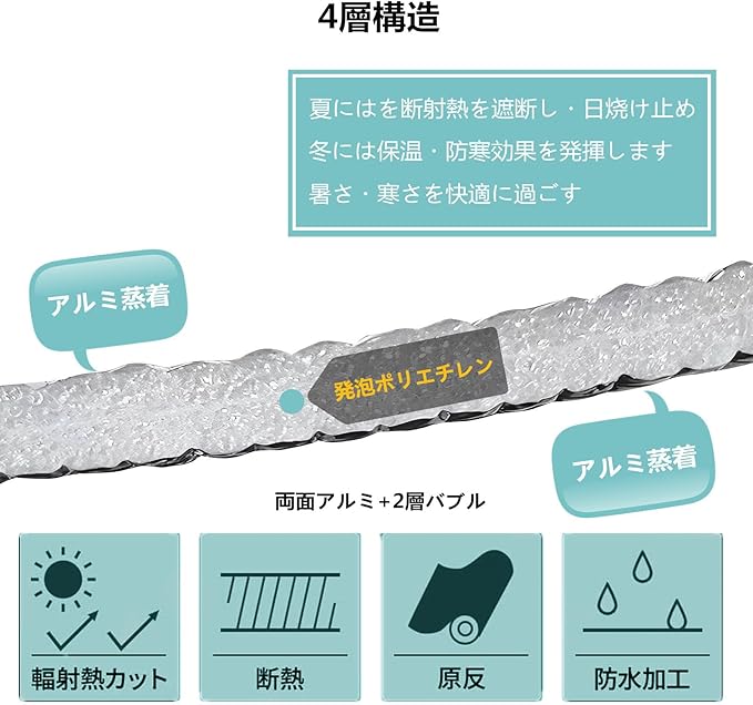【優れた素材】両面PETフィルムは高品質の素材を採用され、糸くずの出にくく、粉塵などが出にくい構成になっています。引張強度や引裂強度、耐熱性、耐水性、耐塵性などに優れています。また、空気層はPEスポンジ素材で作られ、スポンジエアキャップが熱伝導を抑制し、遮熱性柔軟性、耐候性に優れています。