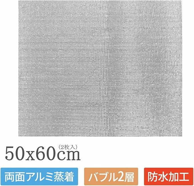 【商品仕様】●サイズ(約):長さ60cm 幅50cm、●厚み:5mm ●材質:PETアルミ・PEスポンジ 。●構造:4層(アルミ層-バブル-バブル-アルミ層)