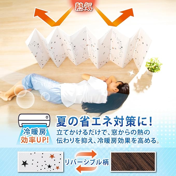 【風よけにも・折りたためる・冬にも活躍】:体温調節が難しい赤ちゃんやご年配の方向けにエアコンの風よけとしても使える。自立するのでどこにでも設置できる。使わないときは折りたたんで片付けられる。冬は窓際やドア付近に設置すれば冷気やすき間風を遮断。暖房効率がUPし節電に繋がる。