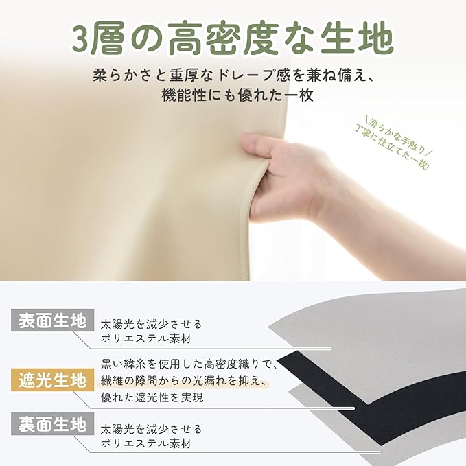 【遮熱保温・省エネ】高密度に織り上げた生地が断熱性を高め、室温の変化を抑えます。夏は熱気を遮断し、冷房の効率を向上。冬は外の寒さを防ぎ、室内の暖かい空気を逃がさずに暖房効率をアップ。ドアカーテンや階段の間仕切り、お部屋の仕切りとして使用することで、エアコンの温度調整がしやすくなり、電気代の節約が期待できます。