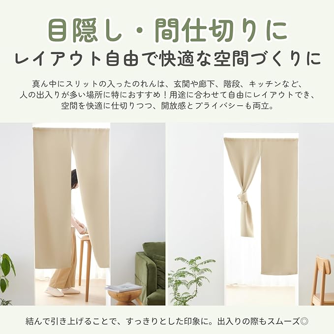【1級遮光・目隠し】無地のカラーバリエーションに加え、高機能な1級遮光カーテン生地を使用した遮光のれん。一般的なのれんよりしっかりと外光を遮断し、透け感が少なく、優れた目隠し効果を発揮します。目線の気になる場所に仕切りとして、収納などちょっと隠すのに最適で、プライバシーを守ります。※一級遮光は光を完全に遮るものではありません。光漏れを気にされる方は遮光効果の高い濃色がおすすめです。