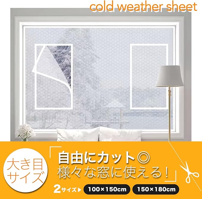 防寒シートは、窓ガラスに貼るだけで冬は防寒、夏は断熱できる省エネエコシート。プチプチのバブルフィルム、エアポケット仕様で熱を逃しません。窓やドアに合わせて使える100 150センチ、150 180センチの2サイズ。