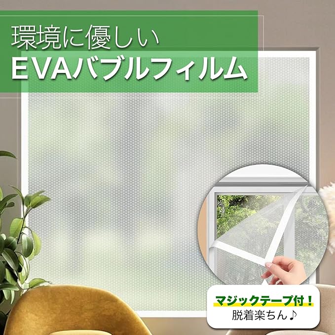窓ガラス防寒、断熱シートは、半透明のEVAバブルフィルムで目隠しや防音対策にも。大判サイズで色々な場所で活躍。ハサミやカッターでカットも楽々。通年使えるのでお財布にも優しい。エアコンの電力消費を抑えて光熱費削減。