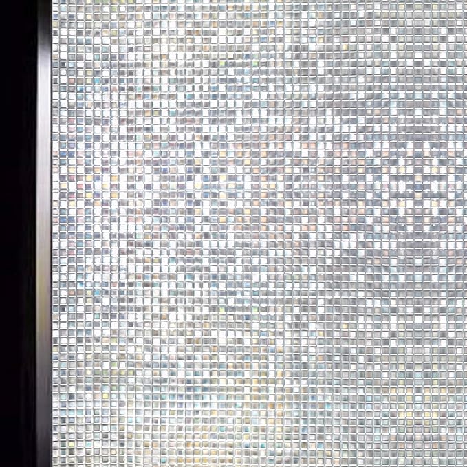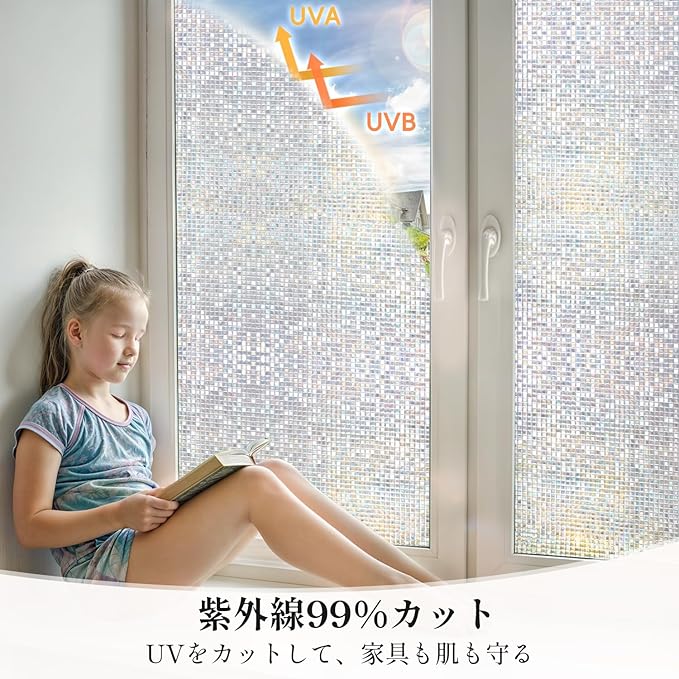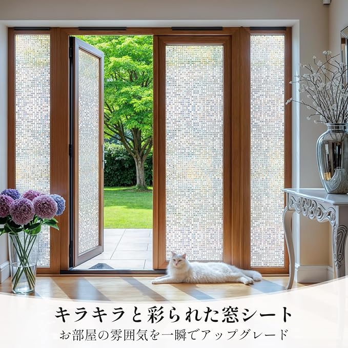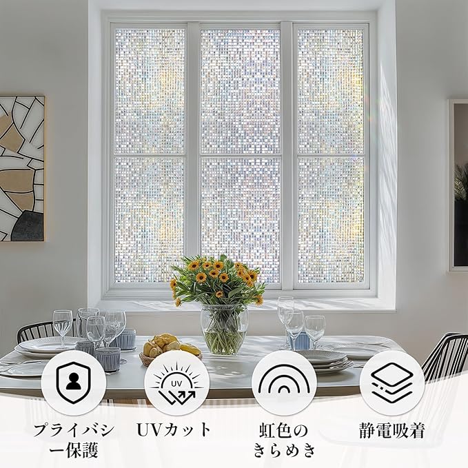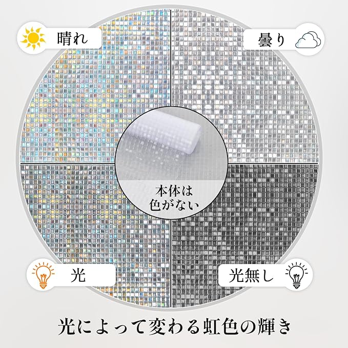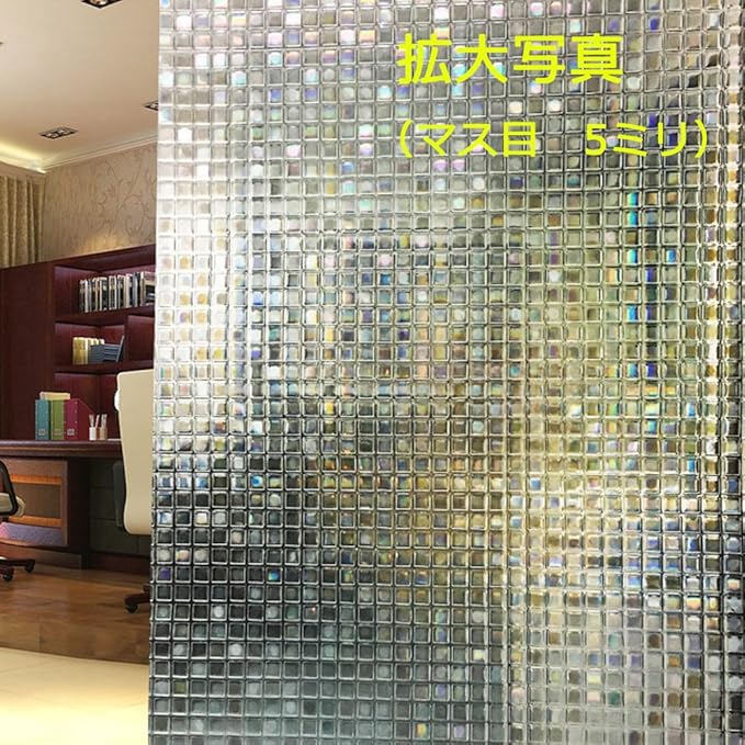 【目隠し、プライバシー保護】フィルムは元々透明なものですが、ガラスに貼れば光を屈折して半透明になって、虹色の艶を放します。光や使用環境によって、色や目隠し効果は少々異なります。光りが当たるとキラキラと虹色に輝きます。天然の日光が差し込む朝・昼も綺麗ですが、人工的なライトが映る夜も綺麗です。部屋のおしゃれな演出と目隠しの両立できます。外から室内が見えづらく、遠い目のプライバシーを保護します。外からの視線を遮りながら、かつ、充分に外の光を室内に取り込めます。カーテンを閉めているときの閉塞感や窮屈感あるの暗い部屋から解放されるでしょう。※目隠しレベル:★★★☆☆ フィルムの格子の模様部分から薄っすら透けて見えるので、お風呂のガラスのような場所に使用することは、お勧めいたしません。