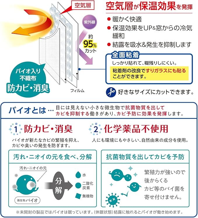 ・バイオの力で窓辺の防カビの効果があります・三層構造のシートの空気層が断熱効果を発揮します・ガラスの表面温度の低下を防ぎ、結露の発生を抑制します・全面粘着のシートだからシートを重ね貼りもできます