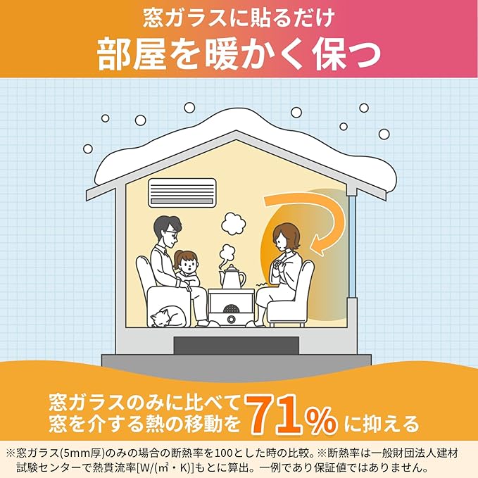 【断熱】窓ガラスに貼ることで窓ガラスの熱の伝わりを抑えます。3層シートの約3.5mmの空気層でグーンと暖房効果アップ!