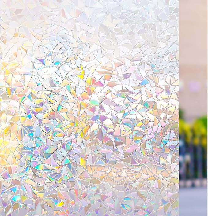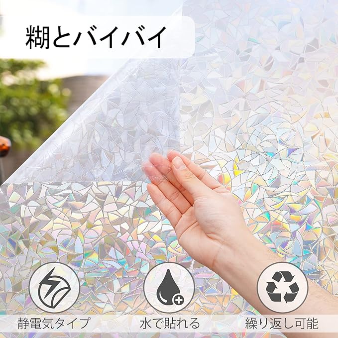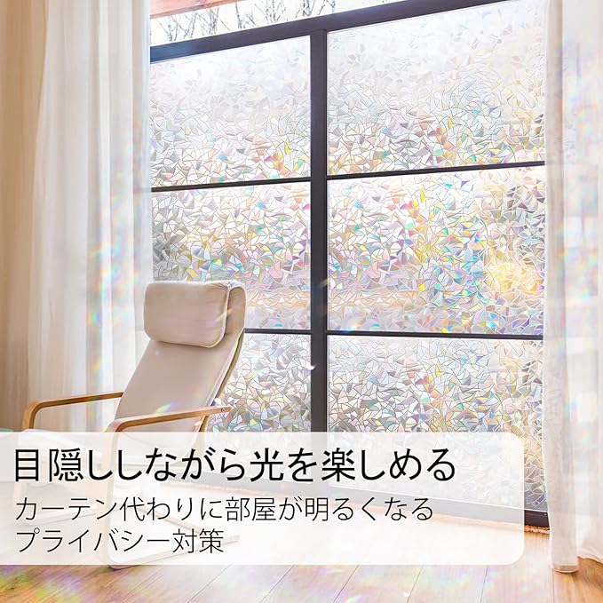 目隠し・UVカット:日差しやライトの光などのあたる所にはれば、虹色になったりし、可視光を反射して目隠しになったりします。光が強ければ強いほどカラフルになります。また、紫外線UVA 84%・UVB99% 以上カットし、際の家具や床材の劣化、肌にもたらす損害を大幅軽減します。要注意:設置の成功は使い方次第です。商品の説明ページの使い方と注意事項を丁寧にお読みください。