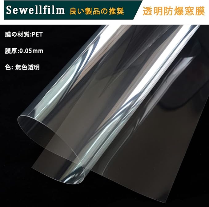 【材料と特性】フィルム厚:0.05mm、材質:PETフィルム、幅タイプ:45cm,60cm,90cm,152cm. 可視光透過96% 耐水性と耐腐食性に優れ、製品の寿命は10年です。