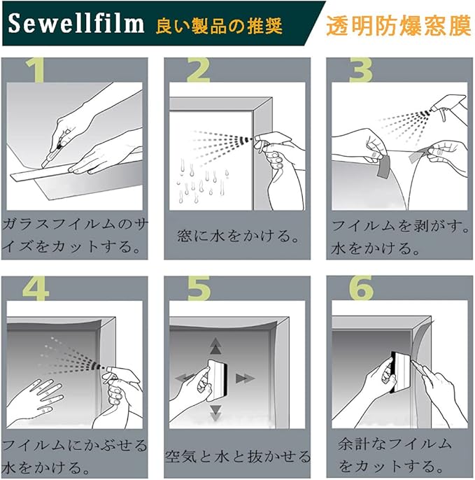 【貼り付け方法】写真にステップがあります。事前に、中性洗剤でガラス面の塵・埃・汚れ等を落とし、ピカピカにしてください。施工しているうちに、窓枠の汚れがたれてきて、汚れが入ってしまうケースもあります。窓枠も綺麗に清掃してください。