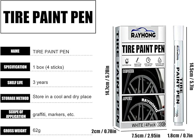 名前: タイヤ ペイント マーカー ペン サイズ:約14.5 1.8cm/5.71 0.71インチ 色: 白 インク内容:約6ml 包装内容明細書: ホワイトタイヤマーカーペン4本 黒板のラベル、車の窓、家の窓、照明パネル、鏡など、さまざまな外装に簡単に書くことができますこの車用ペイント ペンは、タイヤの装飾にも最適です ノート: 手動測定によるサイズのわずかな許容誤差を許容してください写真の照明により、実際の色とは異なる場合があります