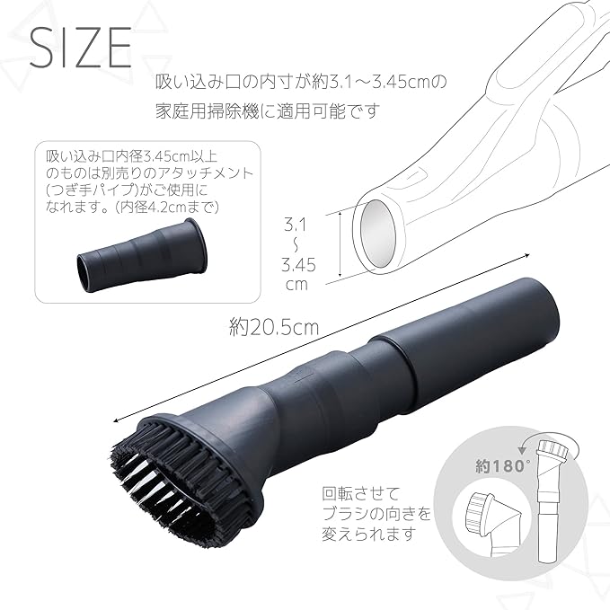 掃除機に取り付けて使用する、ブラシ部分を180度回転させて角度が変えられるノズルです。 各HOTの掃除機でご使用いただけます。(業務用・特殊型除く) 家庭用掃除機吸い込み口の内寸サイズが約31~34.5mmサイズに適用可能です。 カーテンレールやエアコンなどの高いところも掃除がしやすくなります。 ブラシで汚れを掃きながら掃除機で吸い取れます。 [サイズ]約7.7 5 20.5cm [重量]約65g [素材・材質]ポリプロピレン [生産国]中国