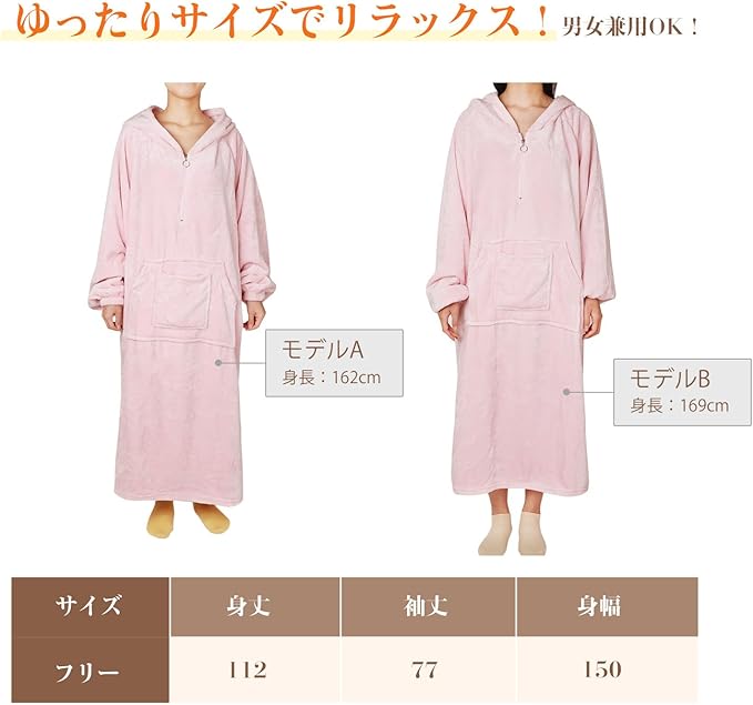【男女兼用着るブランケット】着丈は約112cmのひざ下丈。意外に冷えやすいおしりや腿も、すっぽり包んでくれる安心感と、足さばきの良さを両立しています。ゆったりデザインで、女性と男性のための特大のパーカー着るブランケットです