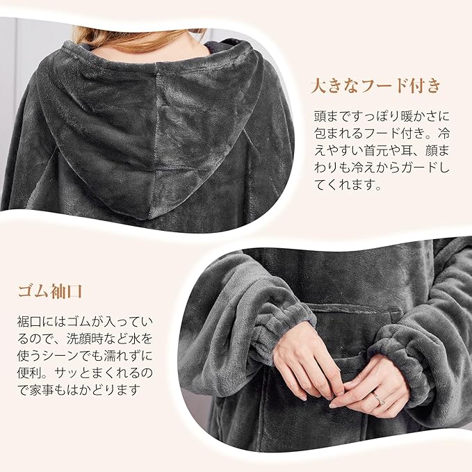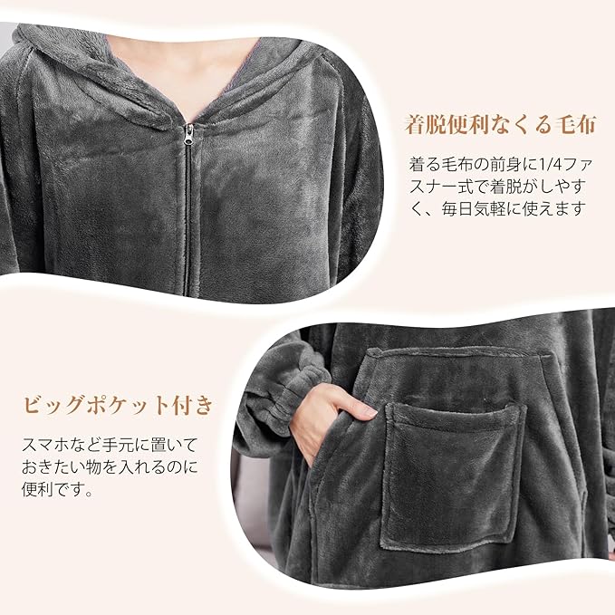 【首に1/4ファスナー付き着脱便利】着る毛布の前身に1/4ファスナー式で着脱がしやすく、毎日気軽に使えます、大きなフードとファスナーで顔まわりや首元も暖かい。