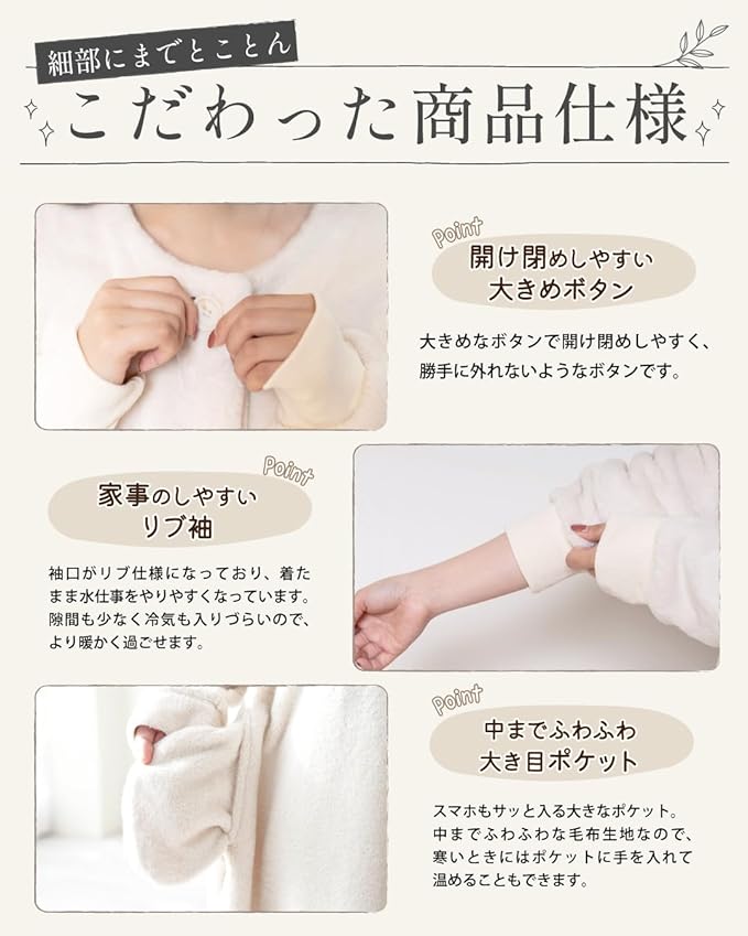 【 毎日を快適に過ごせる 】 動きやすいリブ袖になっており、洗い物や掃除のときにも邪魔になりません。中までふわふわなポケットもついており、スマホの持ち歩きや手が冷えたときにサッと温めることもできます。