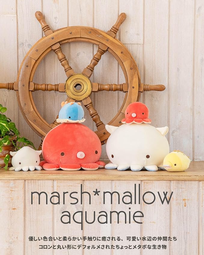 マシュマロのようなふわふわの触り心地の動物たち、《マシュマロアニマルズ》から海のどうぶつたちを集めた《マシュマロアクアミエ》シリーズ。まるいフォルムと丸いお目目のかわいいどうぶつたちの、手のひらサイズのマスコット。