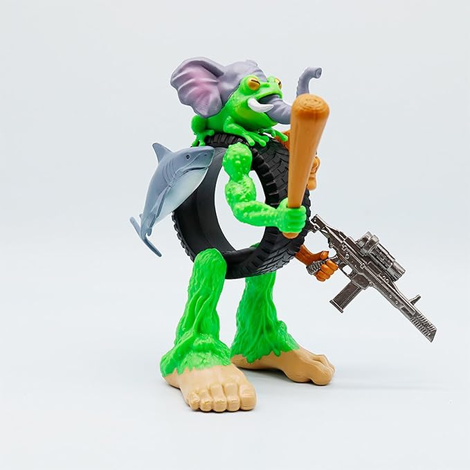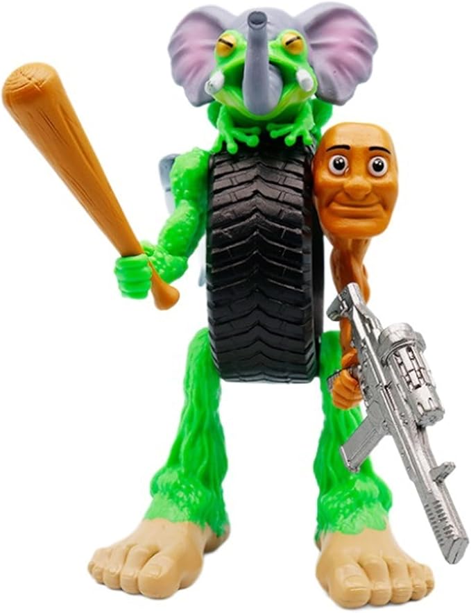 【イタリアンブレインロットフィギュア|要素ミックス】イタリアンブレインロットフィギュアでは、動物や日常のオブジェなど様々な要素を大胆にミックスしています。象やカエル、タイヤ、あるいはサメや時計などが、これらのフィギュア上で不思議な形で融合しており、創意にあふれています