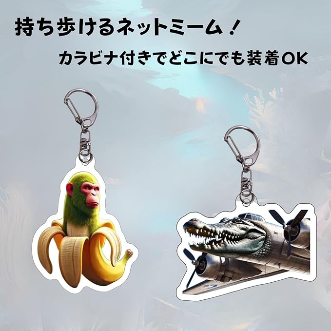 ユニークでちょっぴりカオスなデザインが目を引き、バッグや鍵に付ければインパクト抜群。透明アクリル製でプリントも鮮やか、カラビナ付きで取り付けも簡単です。