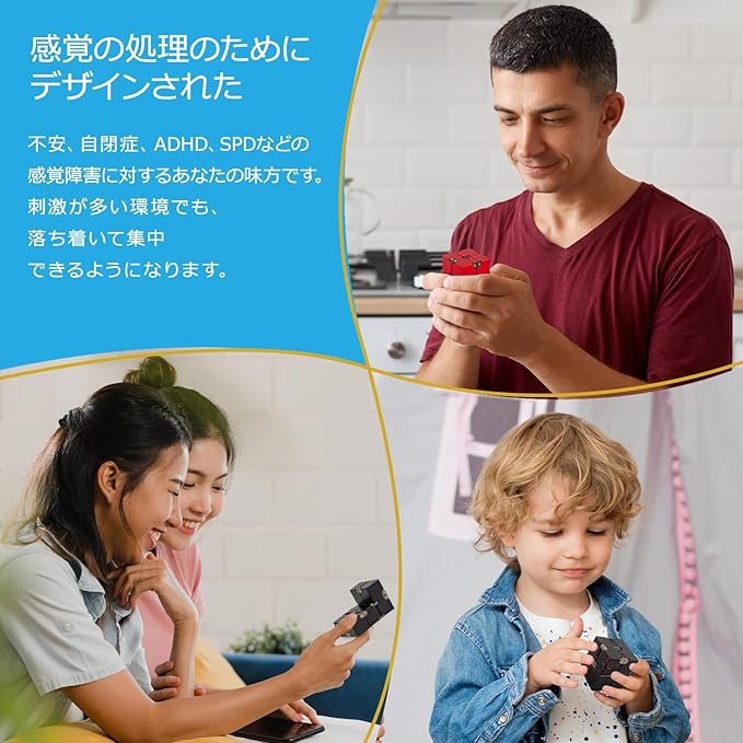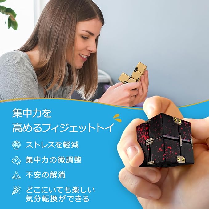 すべての人に最適:theFube Infinity Cubeは、大人にも6歳からの子供にも最適で、特にエネルギーが余っている人、ADD/ADHD、強迫性障害、自閉症、ストレスや不安のレベルが高い人におすすめです。